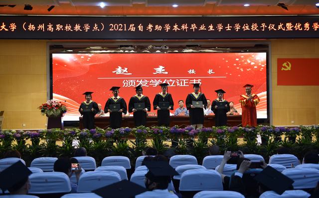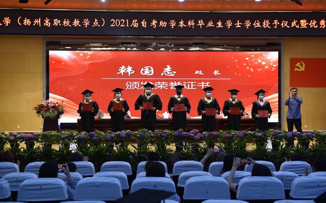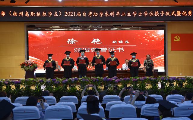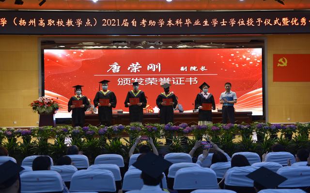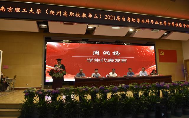 5月25日上午,学校在报告厅隆重举行南京理工大学自考助学2021届本科毕业生学士学位授予仪式。南京理工大学继续教育学院副院长张振伟、办公室主任史炯煜和自考科科长季一鸣、扬州市教育局职社处处长韩国志、扬州教育考试院副院长唐荣刚、学校校长赵杰、副校长徐荣宽、强玉龙、徐艳、相关职能处室负责人、各系部师生代表共同见证这个光荣而神圣的时刻。仪式由副校长强玉龙主持。