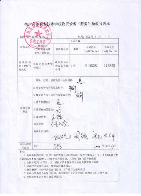 机电系制造类实训耗材验收报告