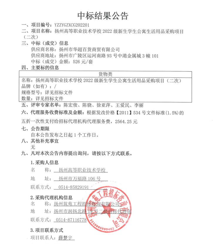 bat365官网登录2022级新生学生公寓生活用品采购项目(二次)中标结果公告