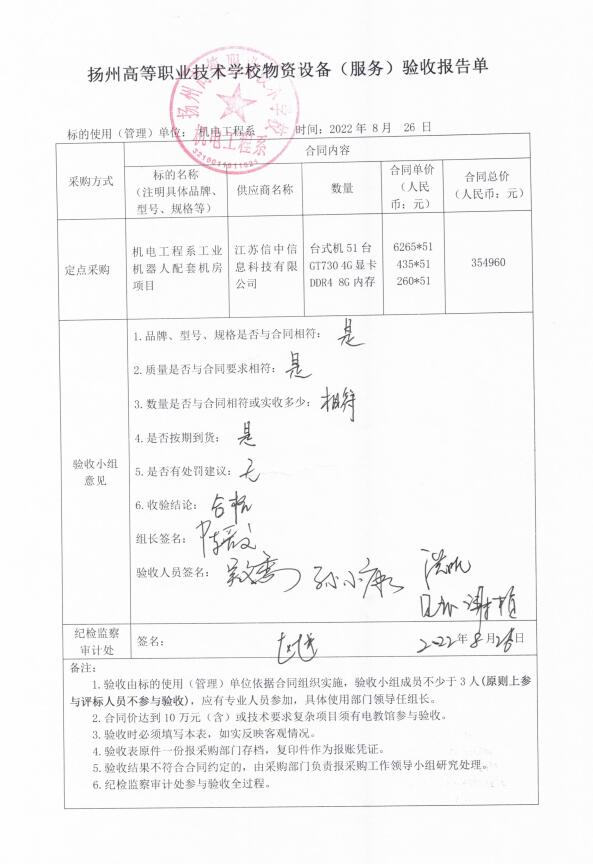 机电工程系机器人项目配套机房电脑验收报告