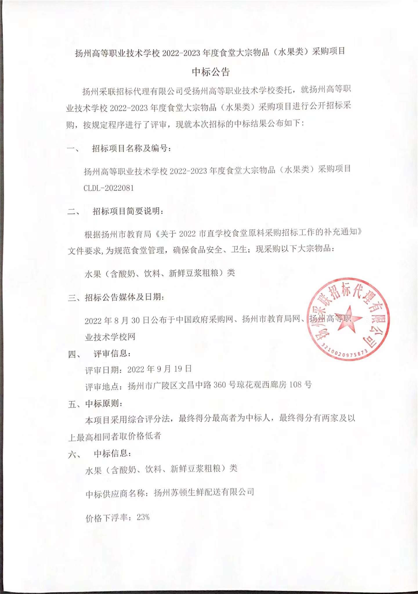 bat365官网登录2022-2023年度食堂大宗物品(水果类)采购项目中标公告