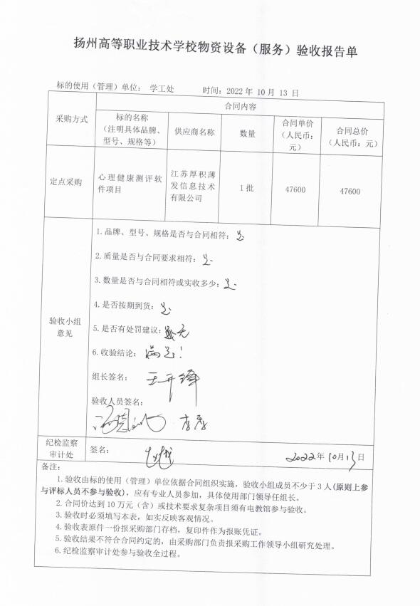 bat365官网登录物资设备(服务)验收报告单(心理健康测评软件项目)