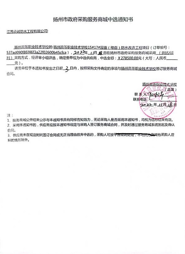 bat365官网登录15#17#屋面(楼面)防水改造工程中标公告