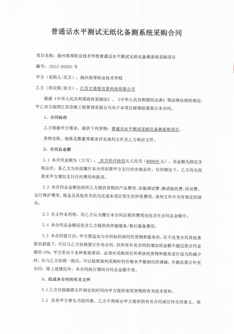 bat365官网登录普通话水平测试无纸化备测系统采购项目合同