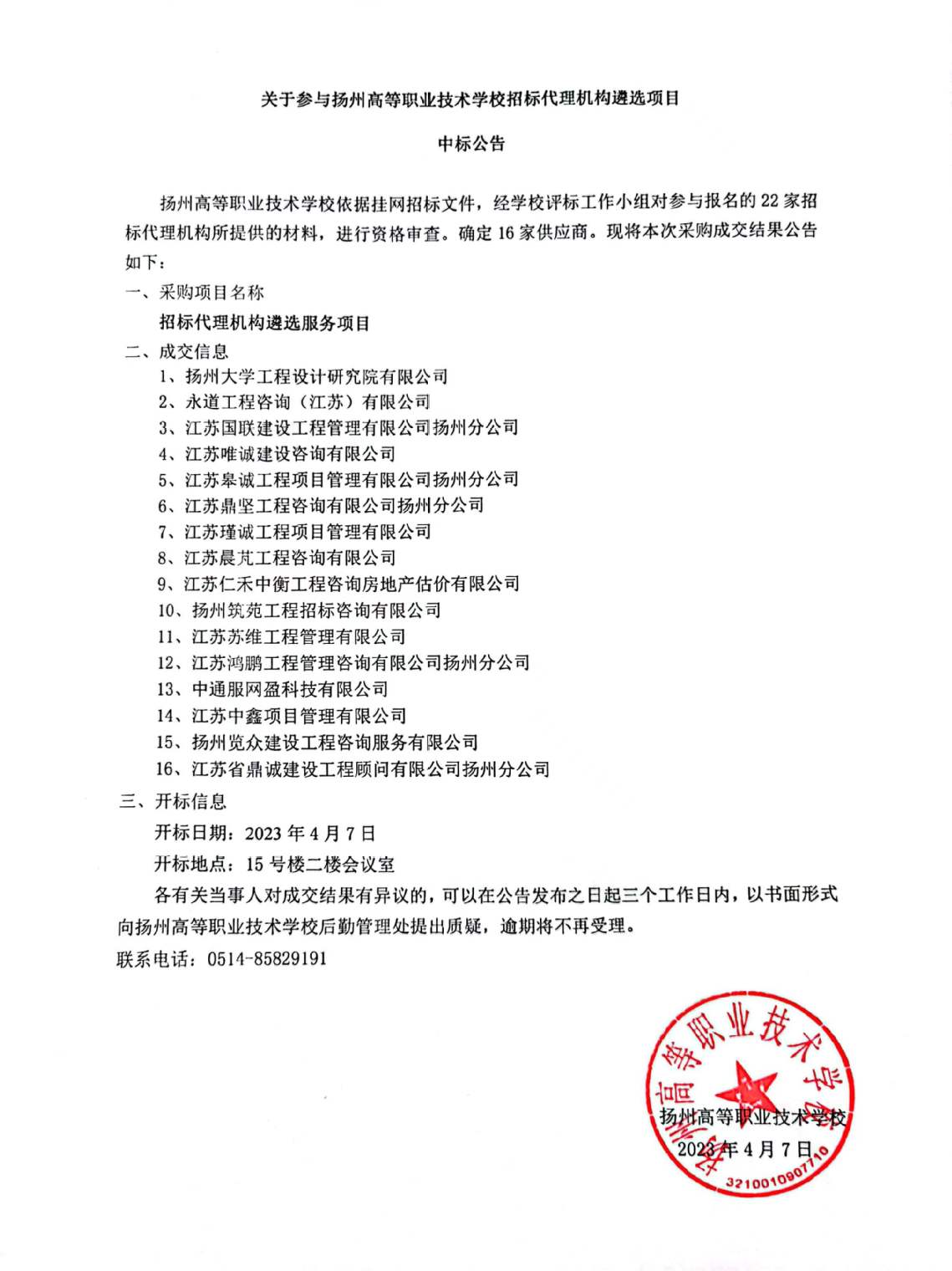 关于参与bat365官网登录招标代理机构遴选项目 中标公告