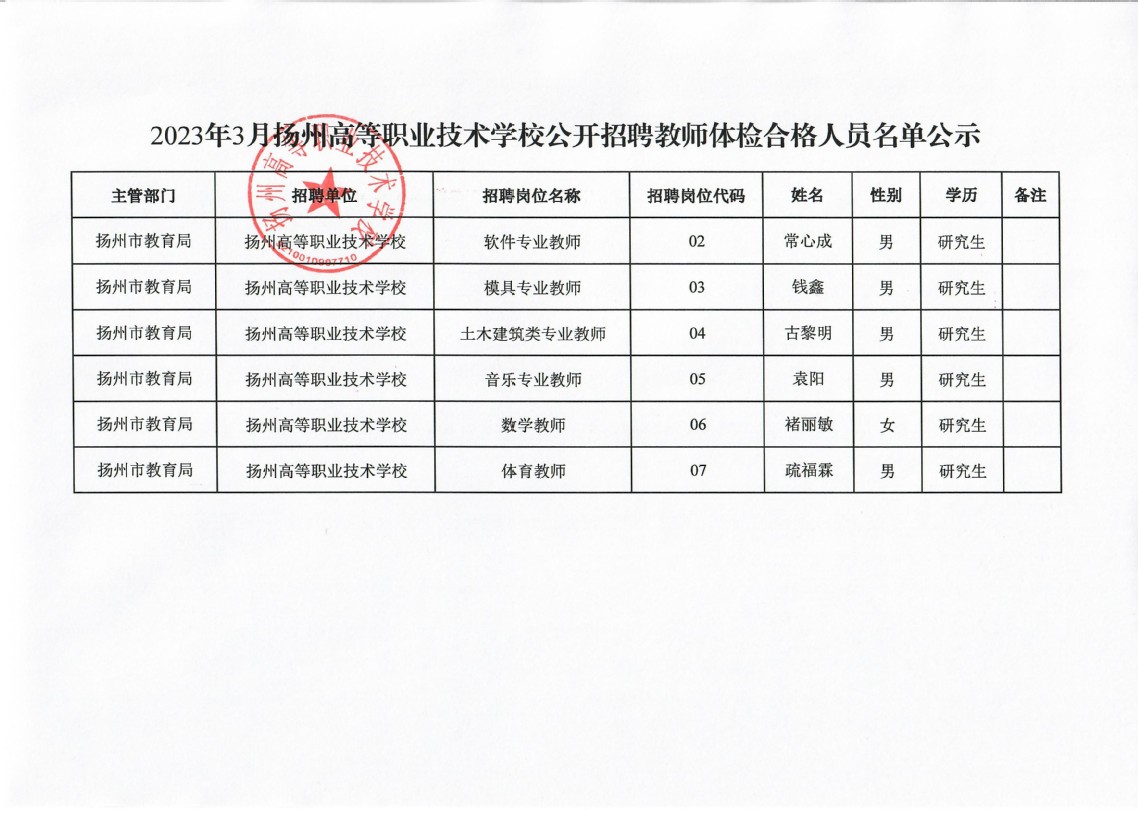 2023年3月bat365官网登录公开招聘教师体检合格人员名单公示