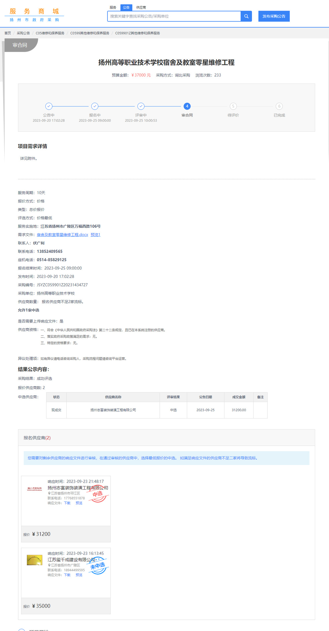 宿舍及教室零星维修工程中标公告