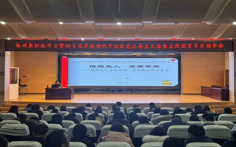 为深入学习贯彻习近平新时代中国特色社会主义思想,深入学习领会习近平总书记关于“讲好中国故事、传播好中国声音”的重要论述,深入学习习近平总书记关于文化自信,建设文化强国的重要论述,1月8日下午,学校举行学习贯彻习近平新时代中国特色社会主义思想主题教育专家辅导报告会,并邀请扬州大学副教授、硕士生导师朱常柏博士作专题辅导报告。学校全体党员参加报告会。
