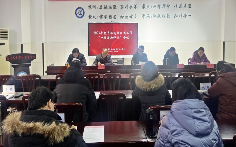 为深入贯彻落实习近平新时代中国特色社会主义思想和党的二十大精神,进一步加强干部队伍建设,根据市教育局《关于开展干部选拔任用工作“一报告两评议”的通知》文件要求,1月24日上午,学校在笃行楼101会议室召开2023年度干部选拔任用“一报告两评议”工作会议,党委领导班子成员、中层正职干部、基层党员代表共35人参加会议。会议由党委书记王朝勃主持。