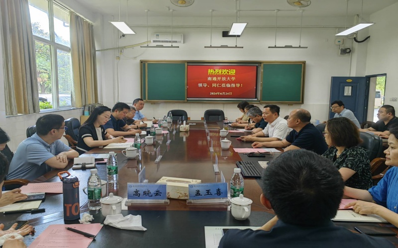 6月24日,南通开放大学(江苏城市职业学院南通办学点)副校长张翔、教务科研处处长张珂峰、质量管理办公室主任张林毅、信息化中心主任张翃等一行8人到我校考察交流。学校党委副书记、校长赵杰,党员委员、副校长强玉龙及相关部门负责人参与交流。