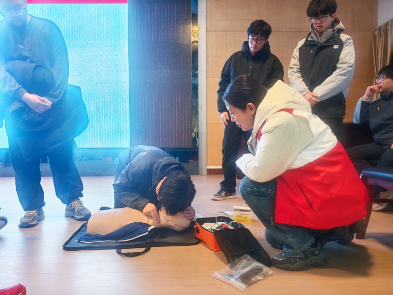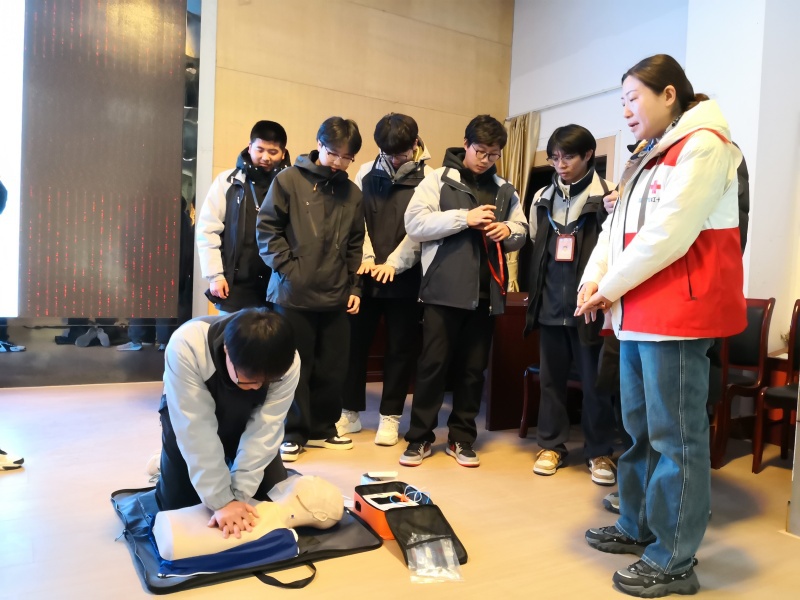 在模拟急救区,学生们分组开展实操训练。智能心肺复苏模拟人实时反馈按压深度和频率,AED训练机同步演示语音指引操作。参训学生需在90秒内完成“评估环境—判断呼吸—胸外按压—AED除颤”全流程,急救导师逐人纠正动作细节。