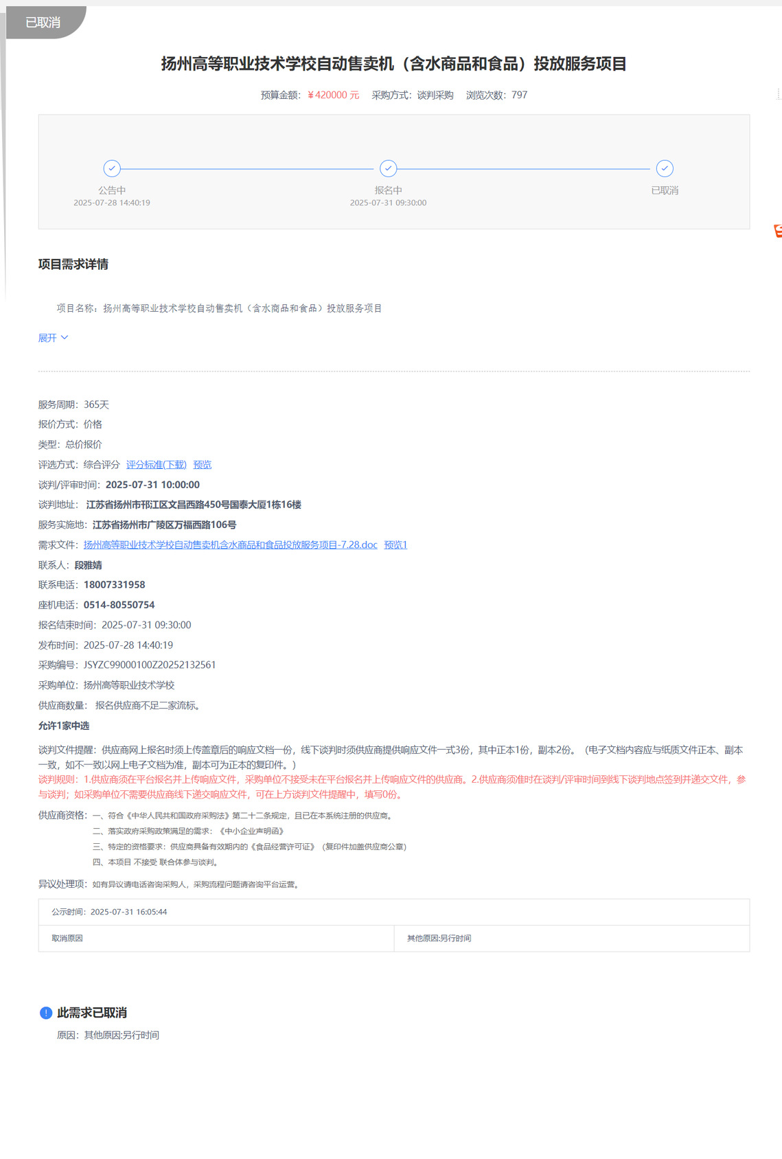 自动售卖机(含水商品和食品)投放服务项目中止公告