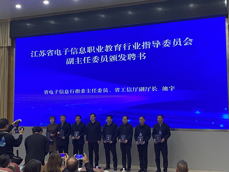 12月13日,江苏省电子信息职业教育行业指导委员会(以下简称“电子信息行指委”)换届大会暨产教融合高质量发展研讨会在南京信息职业技术学院召开。会议正式公布了新一届(2025-2028年)江苏省职业教育行业指导委员会主要组成人员及专委会换届结果,学校凭借在电子信息职业教育领域的深厚积淀与突出成效,成功当选江苏省电子信息行指委副主任委员单位和中职专委会主任委员单位。党委副书记、校长赵杰教授当选省电子信息行指委副主任委员和中职专委会主任委员,贾建伟教授当选中职专委会秘书长。