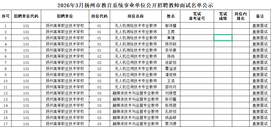 2026年3月公开招聘教师面试名单公示